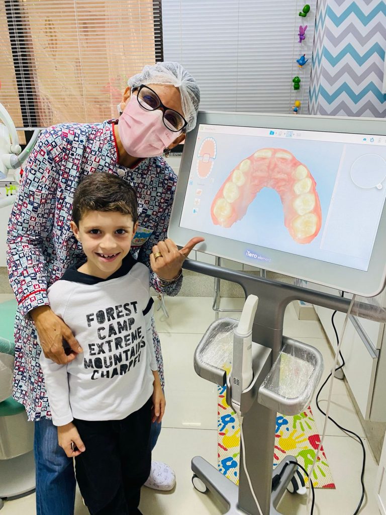 O Itero é um equipamento que realiza a cópia da boca do paciente em alguns minutos e a projeta na tela do computador. Com imagens precisas, essa visualização digital dos dentes e estruturas da boca é instantânea. Isso permite que nós planejemos com mais clareza o tratamento da criança, principalmente quando há a necessidade da utilização de aparelhos ortodônticos e ortopédicos funcionais, além de conseguirmos explicar didaticamente aos pais, com essas imagens, o diagnóstico e quais serão os próximos passos para o atendimento. Muitas vezes o escaneamento substitui a moldagem bucal tradicional que pode ser muito incômoda.